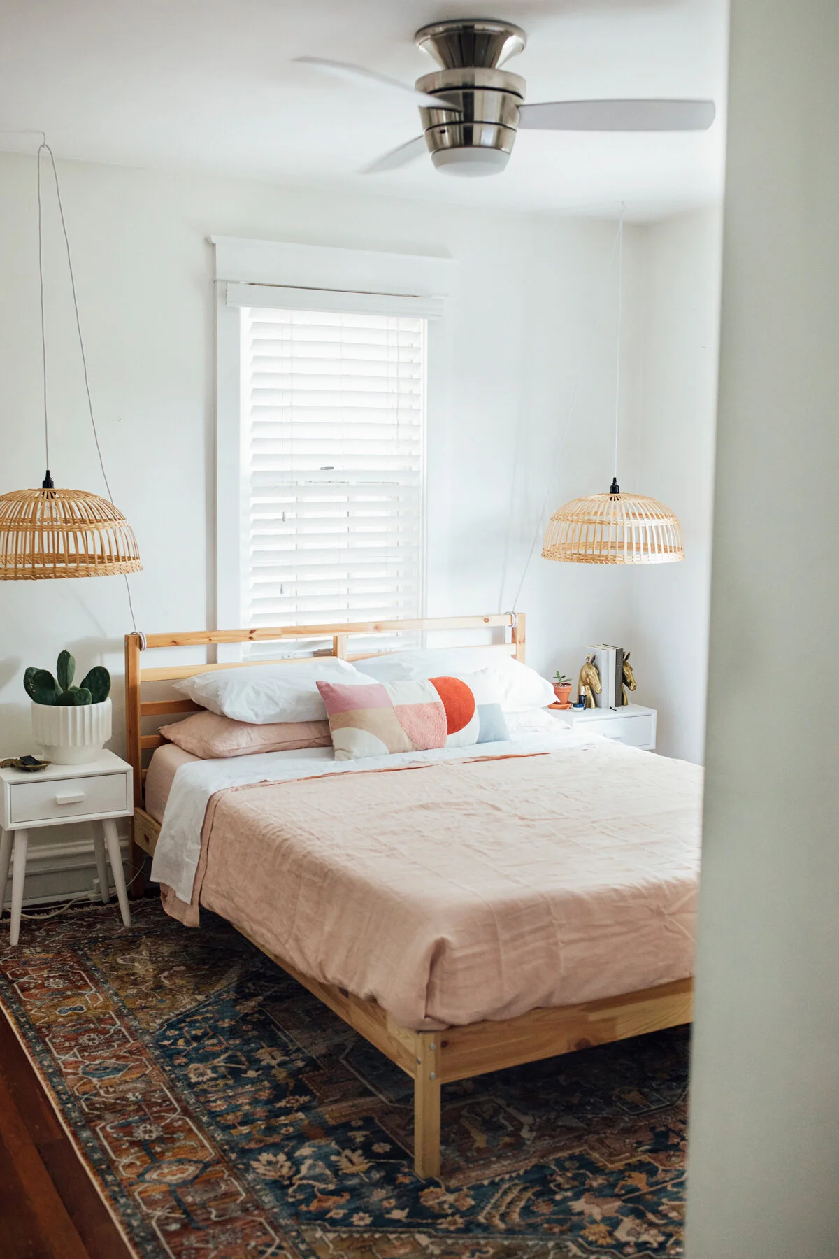 Bedframe | Dusty Rose Linens | Rug | Lampshades & Cords ( One, Two, Three, Four, Five, Six) | White Gear Planter | Macrame Plant Hangers ( One, Two, Three) | Vintage Peg Rack (Similar One Here) | Cotton Rope Buckets | Pink Trashcan ( One, Two) | Vintage Laundry Basket (Alternatives One, Two, Three) | White Nightstands (Alternatives One, Two) | Blue Vase | Wooden Picture Frame | Essential Oils Diffuser | Natural Floor Pouffe